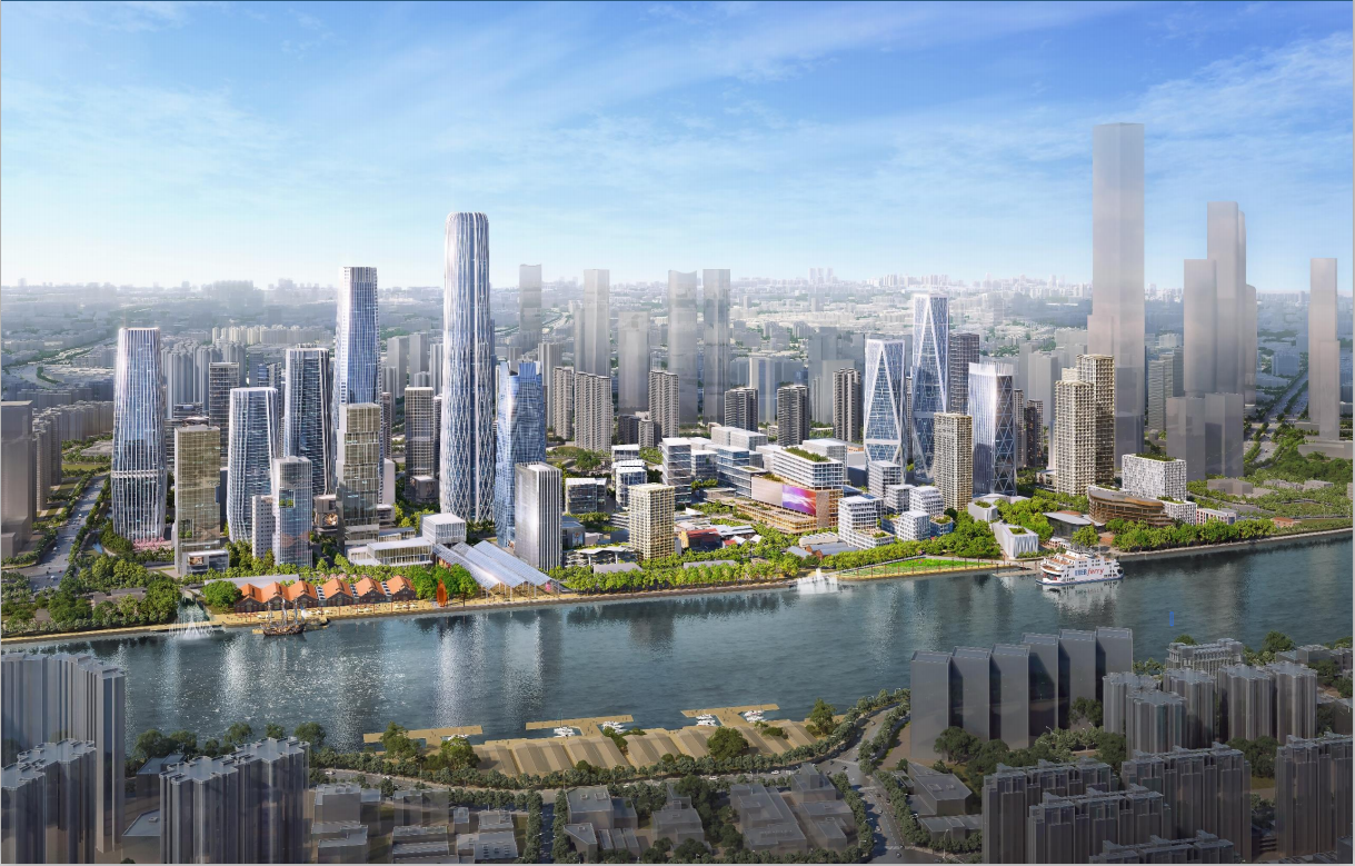 引入SOM国际规划团队开展高品质的聚龙湾片区城市设计,与区域滨江城市天际线协调,北侧白鹅潭综合枢纽高度控制点400米,南侧广船、广钢片区控高点300 米,聚龙湾片区高度控制在350米以内;以沿珠江岸线和河涌向两侧进行梯度式控制、基于街区组团划分与功能进行分片区规划和控制、结合TOD站点设置超高层建筑等为原则,打造既与沿江界面和谐统一,又独具特色的城市天际线。