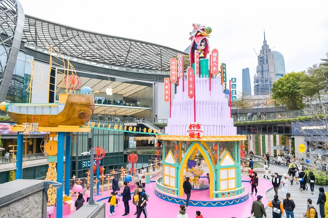 天环的灯饰高13米在天环广场的花园平台,13米高的新春幸运塔楼成为了整条天河路最大亮点,塔尖的岭南特色喜萌醒狮和一身潮服的萌娃抢眼,粤式新春热闹气氛瞬间点燃。