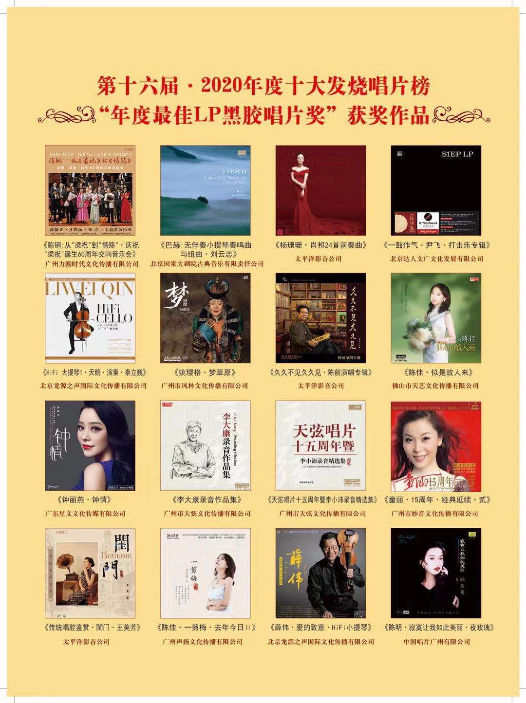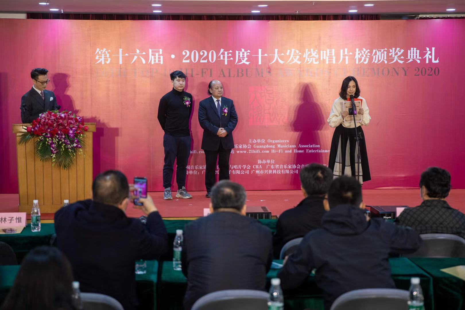 由广东省音乐家协会、www.21hifi.com影音专业网站主办,中国音乐家协会录音艺术与唱片学会、广东省音乐家协会音乐与音响艺术委员会协办的第十六届·2020年度十大发烧唱片榜颁奖典礼于1月17日在广东省文学艺术中心会议厅隆重举行。现场共颁出了“年度十大发烧唱片奖”、“年度单项奖”、“年度最佳LP黑胶唱片奖”共66个奖项。