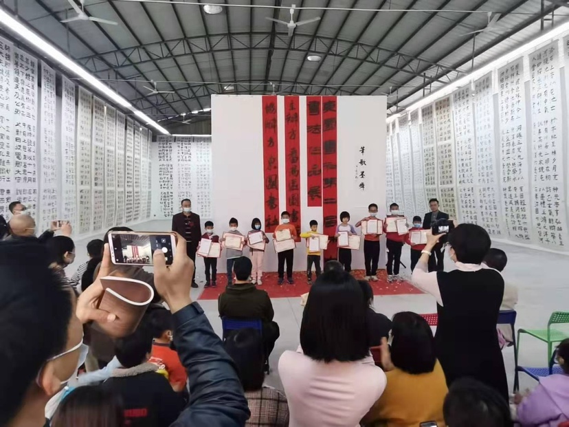 1月17日,由番禺区图书馆主办、东园书社承办的“翰墨迎春”青少年书法作品展在沙湾街紫坭堂6号展览厅举行,一幅幅由“小书法家”创作的高6米宽1.5米的鸿篇巨制书法作品,让参观者大为赞赏。参加活动的领导嘉宾为一批获奖的作者颁发了奖状。