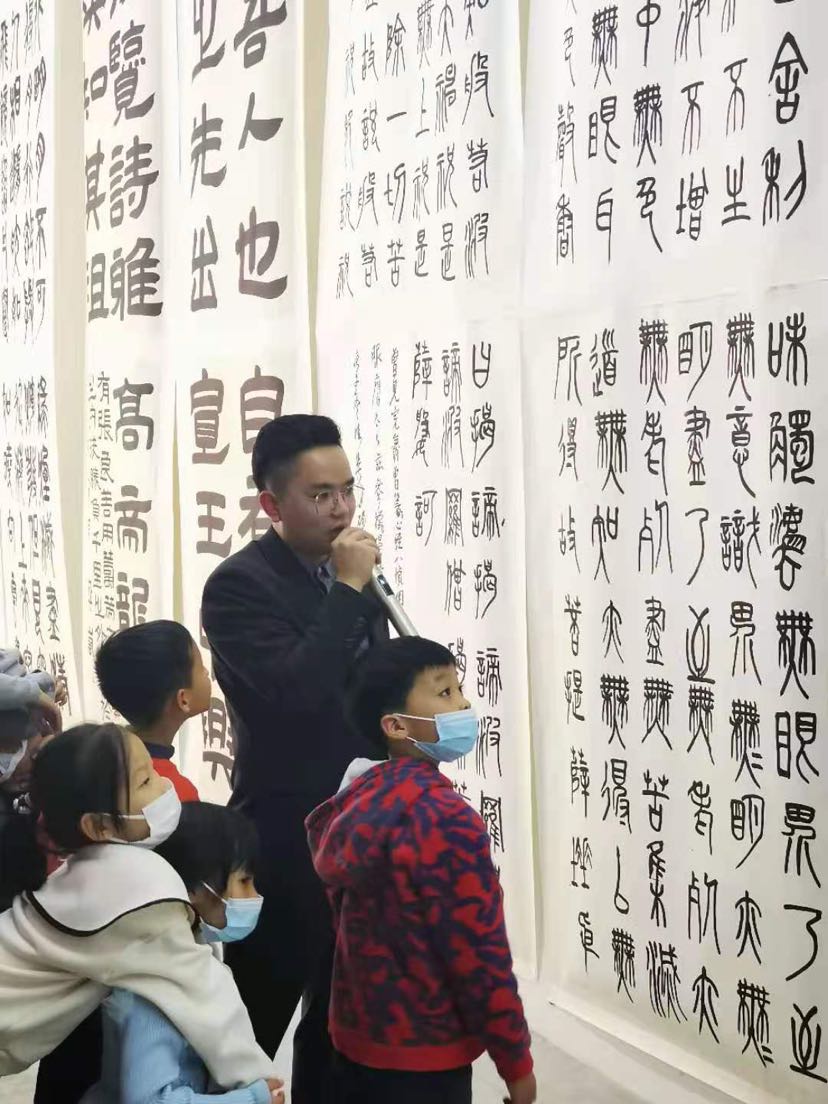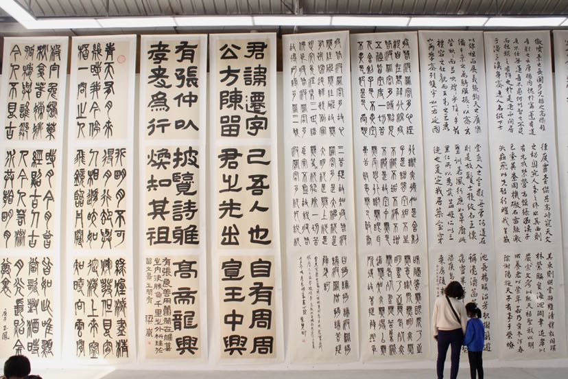 这次展览展出作品共100多件,其中6米高作品有60多件,四尺、六尺整30多件,硬笔作品40件。展出作品包括篆、隶、楷、行、草五种书体。