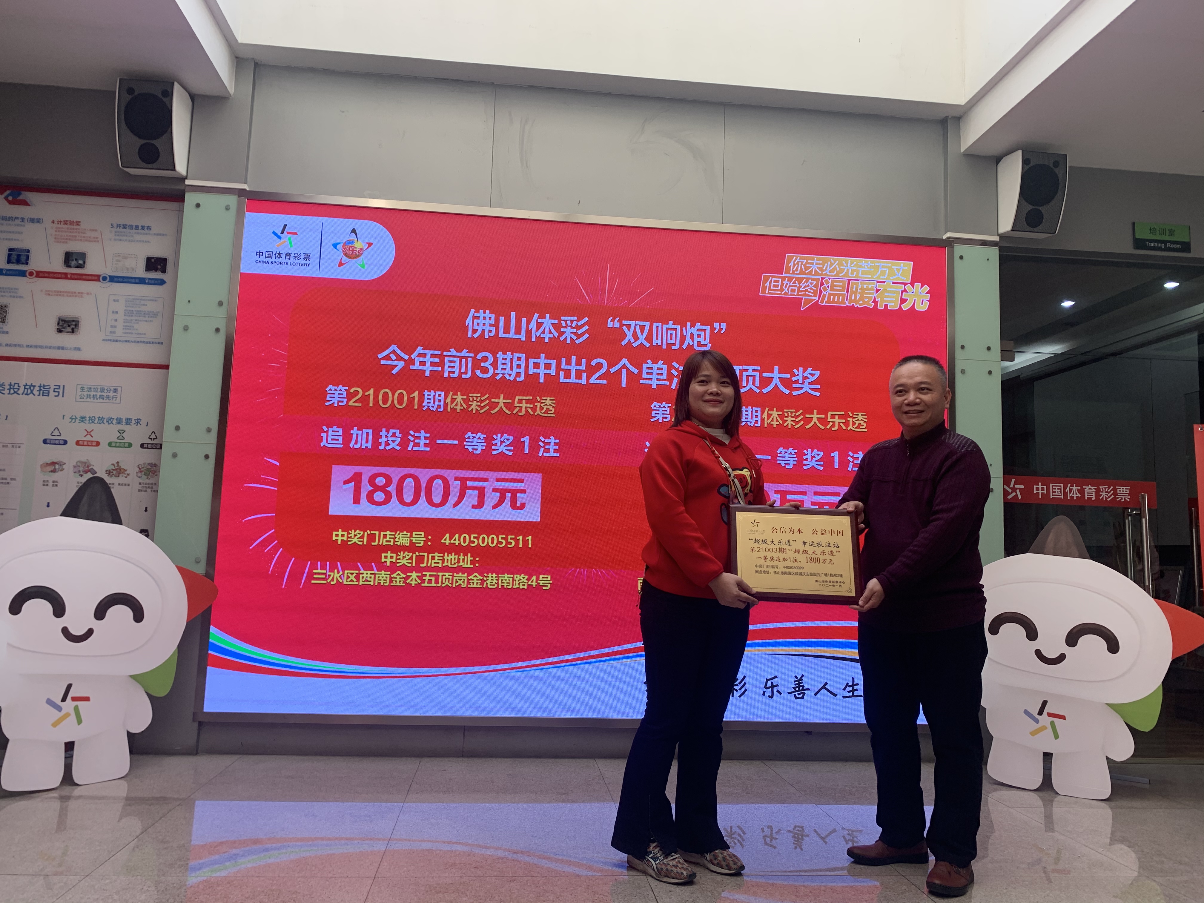 1月2日,2021年第1期体彩大乐透开奖,佛山的邓先生(化姓)以1张15元的5注单式追加票中得大奖。1月6日,杨先生(化姓)以1张9元的3注单式追加票,揽得21003期大乐透1注1800万元大奖。5天内中出2个大乐透封顶1800万元大奖,这在佛山乃至全省的大乐透中奖史上也不多见。1月18日,两名购彩者乔装打扮成“福牛”来到佛山市体彩中心领奖。