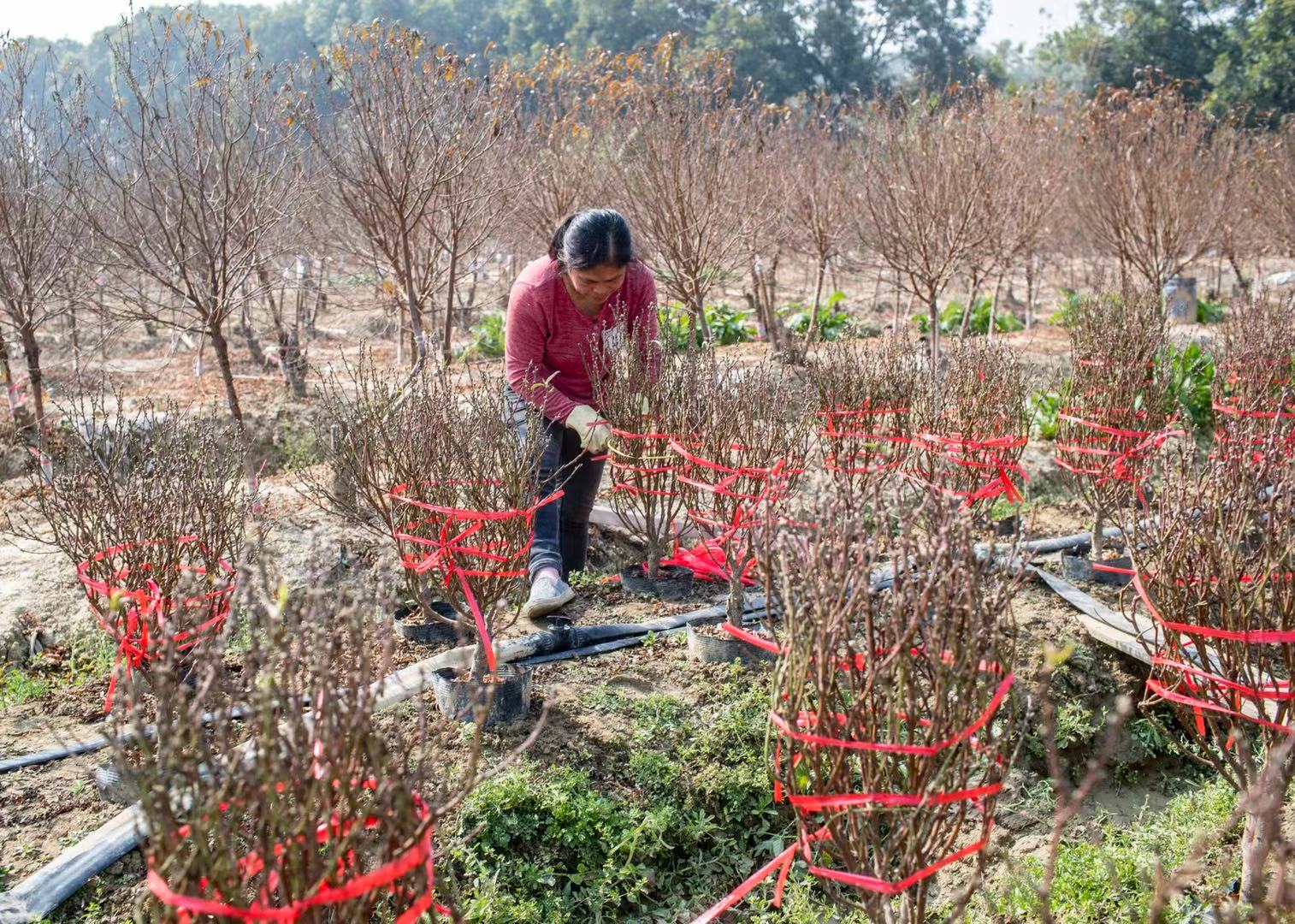 来到均禾街石马村,一片片的桃花田映入眼帘。花农们正忙碌着把桃树上的叶子摘掉,并陆续把一些准备上市的桃花扎起来。漫步桃花林间,偶然看见三五朵桃花在枝头斗艳争芳,让人好一阵惊喜。“我们把这些叫做‘姣婆花’(粤语,此处比喻爱打扮,爱美丽),这么早就迫不及待地开了”,花农陈锐庄笑着说。