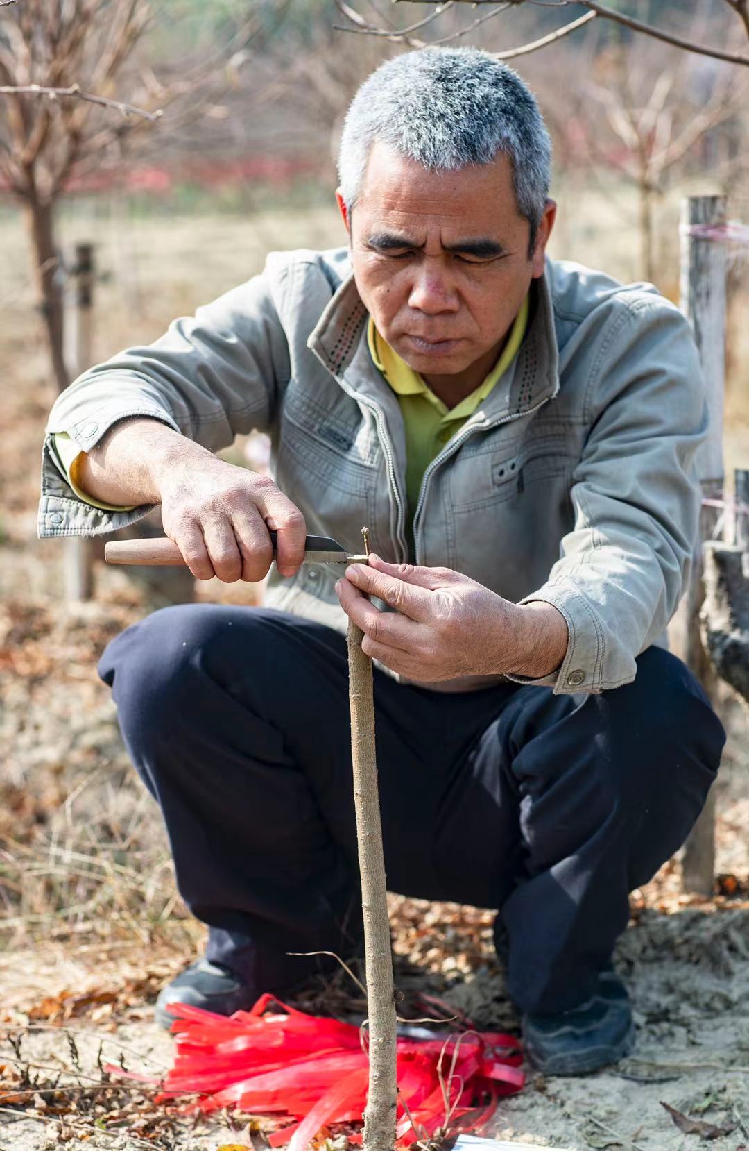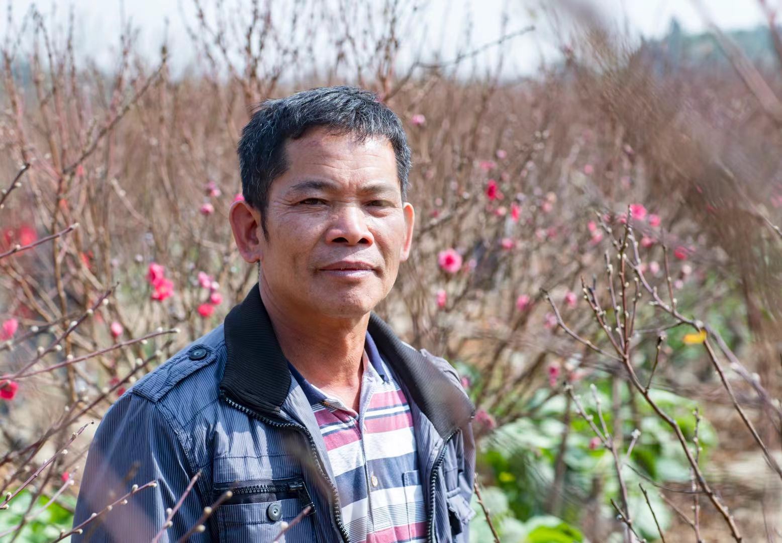 今年57岁的陈锐庄是土生土长的石马村村民,八九岁的时候就开始跟着父亲学种桃花,一种就种了40多年。“今年的石马桃花特别靓!”他指着枝头饱满的花蕾说:“2020年是双春兼闰四月,也就是春季的时间长了,桃花的生长期比以往多了20多天,养分就更充足,加上去年雨水比较适中,今年的桃花的话况很好”。