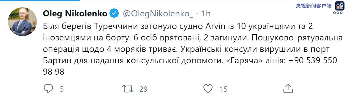 乌克兰国家通讯社17日报道,乌克兰外交部发言人尼科连科(Oleh Nikolenko)在其官方推特账户上发布消息称,载有10名乌克兰人和2名外国人的一艘名为阿尔文(Arvin)的船只在土耳其沿海沉没。