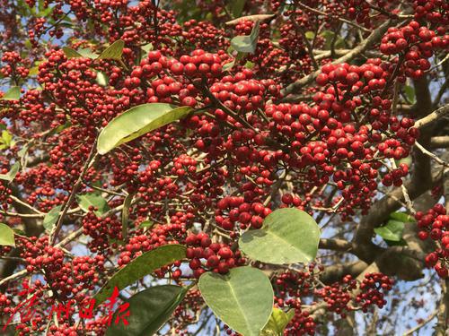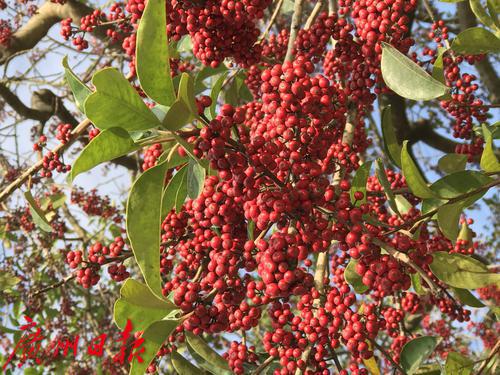 满树的红果将绿叶包围据介绍,铁冬青又名救必应、熊胆木、白银香、过山风,为冬青科常绿乔木,全年枝叶稠密浓绿。3-4月盛开黄白色的小花,芳香,花单性,雌雄异株;开花后结果,果由黄转红,秋后11月份果实成熟,深红色,椭圆形,有光泽,像一颗颗迷你山楂果,灿烂夺目,十分可爱。挂果期长,可延至春节后,是优良的观果植物,适合做行道树、庭园遮阴树,或做盆景;树皮可提制染料和栲胶;枝叶可造纸;木材作细工用材。