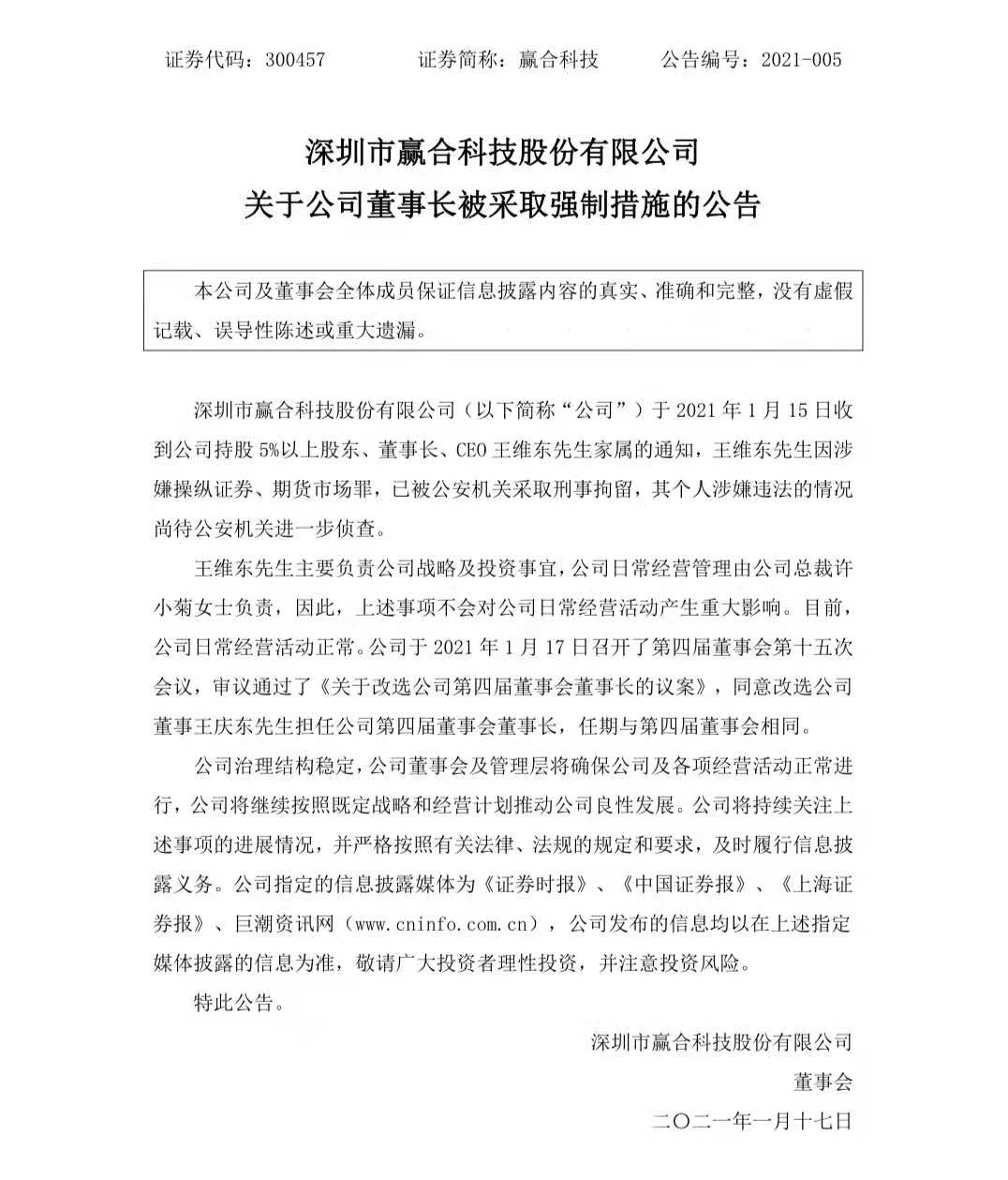 1月17日晚间,赢合科技披露称,公司于1月15日收到公司持股5%以上股东、董事长、CEO王维东家属的通知,王维东因涉嫌操纵证券、期货市场罪,已被公安机关采取刑事拘留,其个人涉嫌违法的情况尚待公安机关进一步侦查。