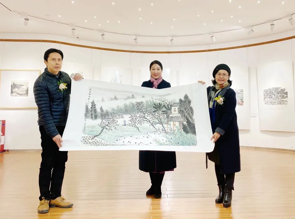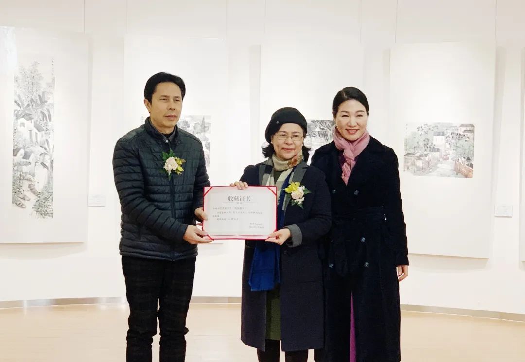 陈树人纪念馆馆长陈美霞接受叶其嘉、何婉薇赠予陈树人纪念馆的作品《花儿开正好》,并回赠收藏证书。