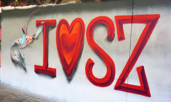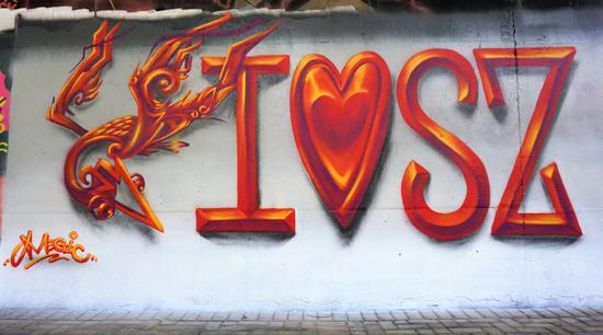 在这里,Megic正在用红黄色的喷漆绘制出利索的线条,几笔后组成了一幅“我爱深圳”的英文缩写变形字,明暗搭配的色彩让整幅作品更显立体。在字母旁边,他配上了一只风格抽象的大鹏,寓意鹏城。