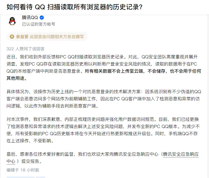 1月18日,腾讯QQ在其知乎官方号上回答该提问时表示,近日,我们收到外部反馈称PC QQ扫描读取浏览器历史记录。对此,QQ安全团队高度重视并展开调查,发现PC QQ存在读取浏览器历史用以判断用户登录安全风险的情况,读取的数据用于在PC QQ的本地客户端中判断是否恶意登录。所有相关数据不会上传至云端,不会储存,也不会用于任何其他用途。