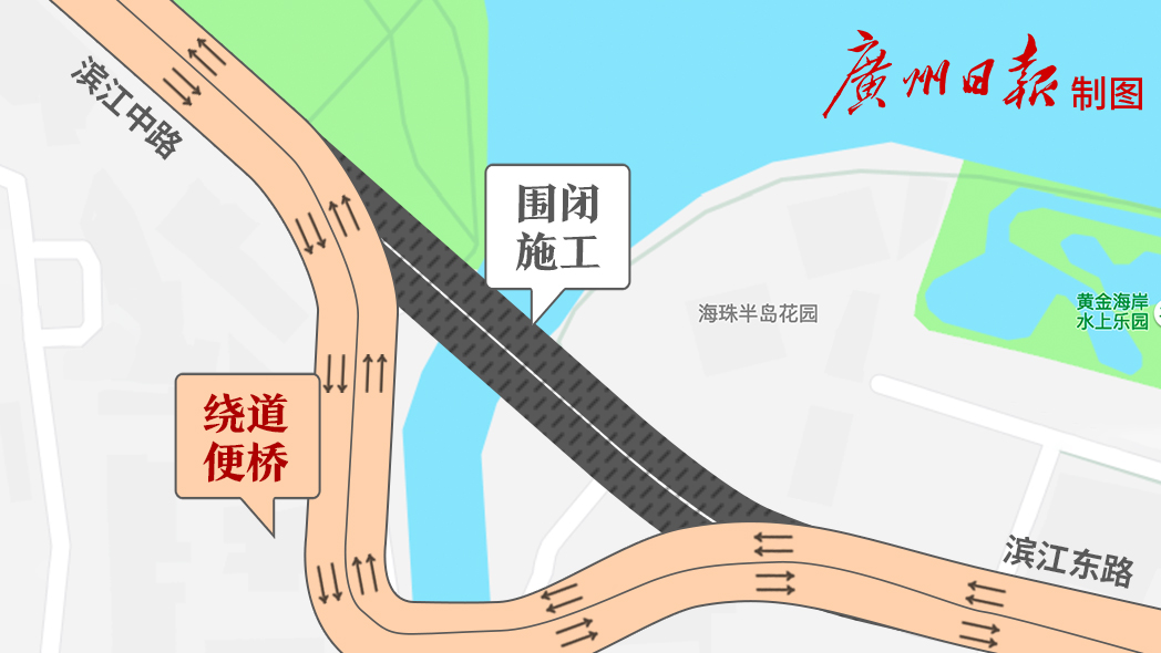 目前行经滨江东路鸭墩桥的行人车辆将绕行怡乐路口和海珠涌钢便桥。