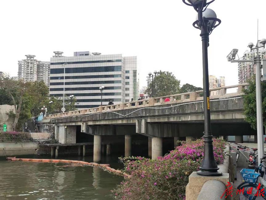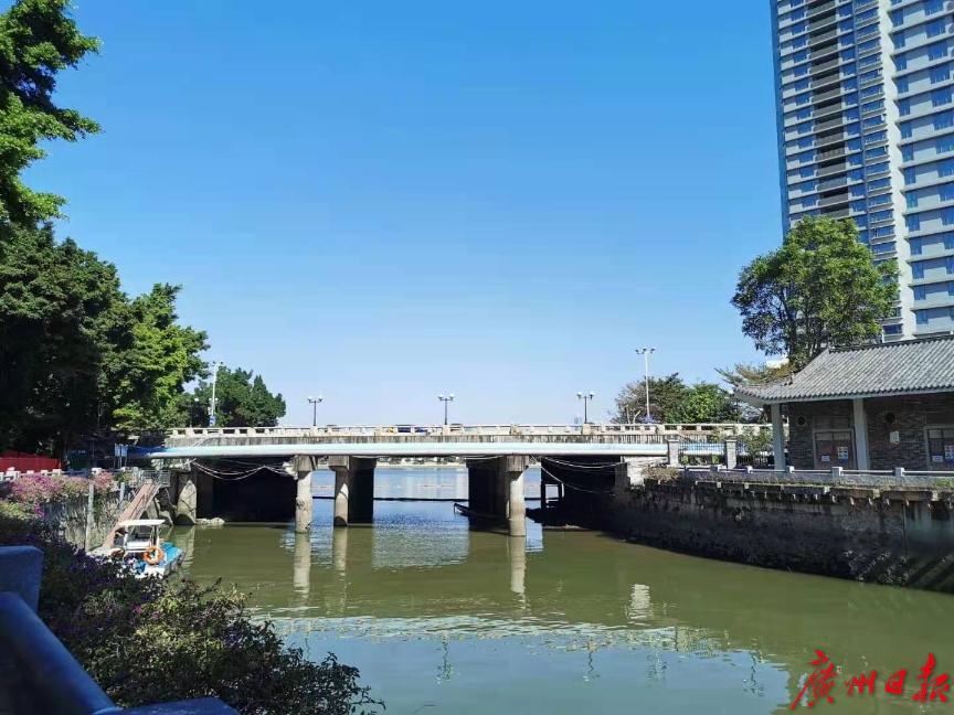 从钢便桥位置看鸭墩桥。可能很多行经滨江路的市民都没发现,其实连接珠江泳场和海印公园段的是一座平缓的桥梁,这座桥名为鸭墩桥(因海珠涌北段又称鸭墩涌得名)。鸭墩桥规划大修已经多年,但因是交通要道一直没法实施。故几年前就计划与十号线施工同步实施大修,知情人士介绍,这次大修计划是拆除重建。为此,需要在南侧涌面上修建一座交通疏解便桥。
