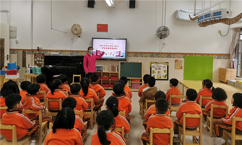 主持人陈老师通过PPT课件,有趣的问答,向幼儿们简单地介绍当前疫情防控形势,根据《广州市教育局致全市学生家长的一封信》,倡导幼儿在寒假春节期间合理安排出行,尽量在穗过节。同时与幼儿共同回顾如何科学地做好个人防护。幼儿们纷纷举起小手,争先恐后地回答:“戴好口罩、勤洗手不乱摸、咳嗽打喷嚏时要用手遮挡......”。