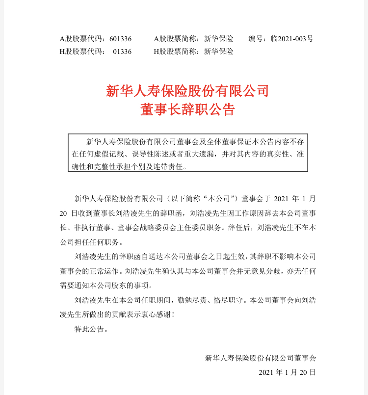 新华保险(601336.SH)20日晚间发布董事长辞职公告。公告称,公司董事会于2021年1月20日收到董事长刘浩凌的辞职函,刘浩凌因工作原因辞去本公司董事长、非执行董事、董事会战略委员会主任委员职务。辞任后,刘浩凌不在新华保险担任任何职务。