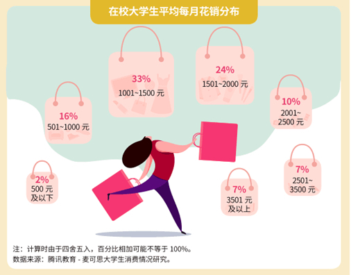 大学生消费情况研究数据显示,在校大学生每月平均花销(不含学费、家庭与学校间往返交通费)在1001~1500元的占比最高,为33%;花销为1501~2000元的大学生比例也较高,为24%。有18%的大学生每月花销在1000元及以下。父母和亲戚提供是大学生生活费主要来源。