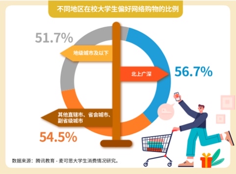 从不同地域来看,越是经济发达地区,偏好网络购物的大学生比例越高。在“北上广深”就读的大学生,有56.7%更偏好网络购物,但在地级城市及以下地区,这个比例为51.7%。