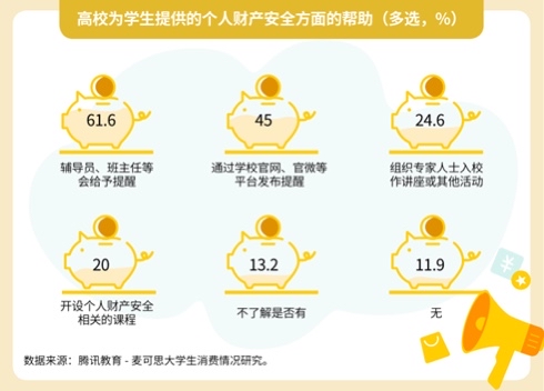 从在校大学生的反馈来看,目前高校提供的个人财产安全方面的帮助主要为“辅导员、班主任等会给予提醒”(61.6%),以及通过学校官网、官微等平台发布提醒(45%)。还有11.9%的大学生表示所在大学未给学生提供个人财产安全方面的帮助。