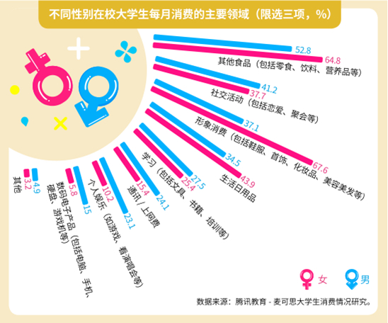 不同性别大学生每月主要花销存在差异,男生在个人娱乐活动、购买数码电子产品、通讯/上网费方面的花销占比明显高于女生,而女生投入形象消费、购买零食的消费占比明显高于男生。