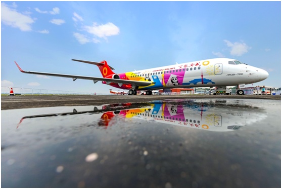 这架飞机是我国的国产飞机ARJ21,采用的是“中国梦”涂装,涂装设计运用简洁抽象的几何图形勾勒出成都锦绣天府塔、安顺廊桥、上海环球金融中心等的形象。