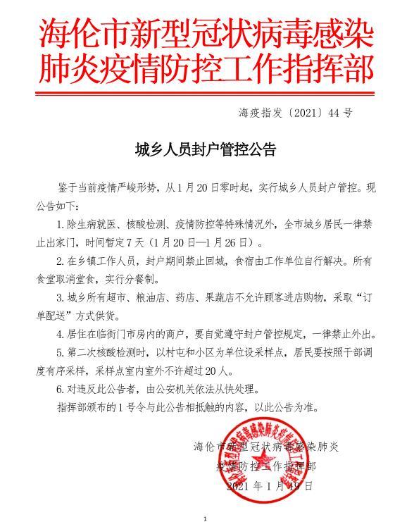 19日,记者从海伦市新型冠状病毒感染肺炎疫情防控工作指挥部了解到,鉴于当前疫情严峻形势,从1月20日零时起,实行城乡人员封户管控。现公告如下:
