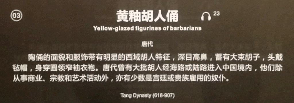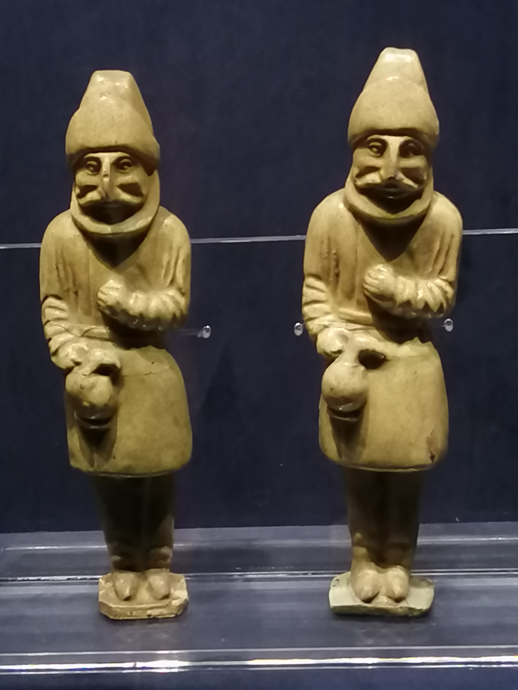 广州博物馆里收藏着两件黄釉胡人俑,唐代出品,釉色润泽,做工非常好。胡人头戴毡帽,身穿窄袍,高鼻深目,神态平静。
