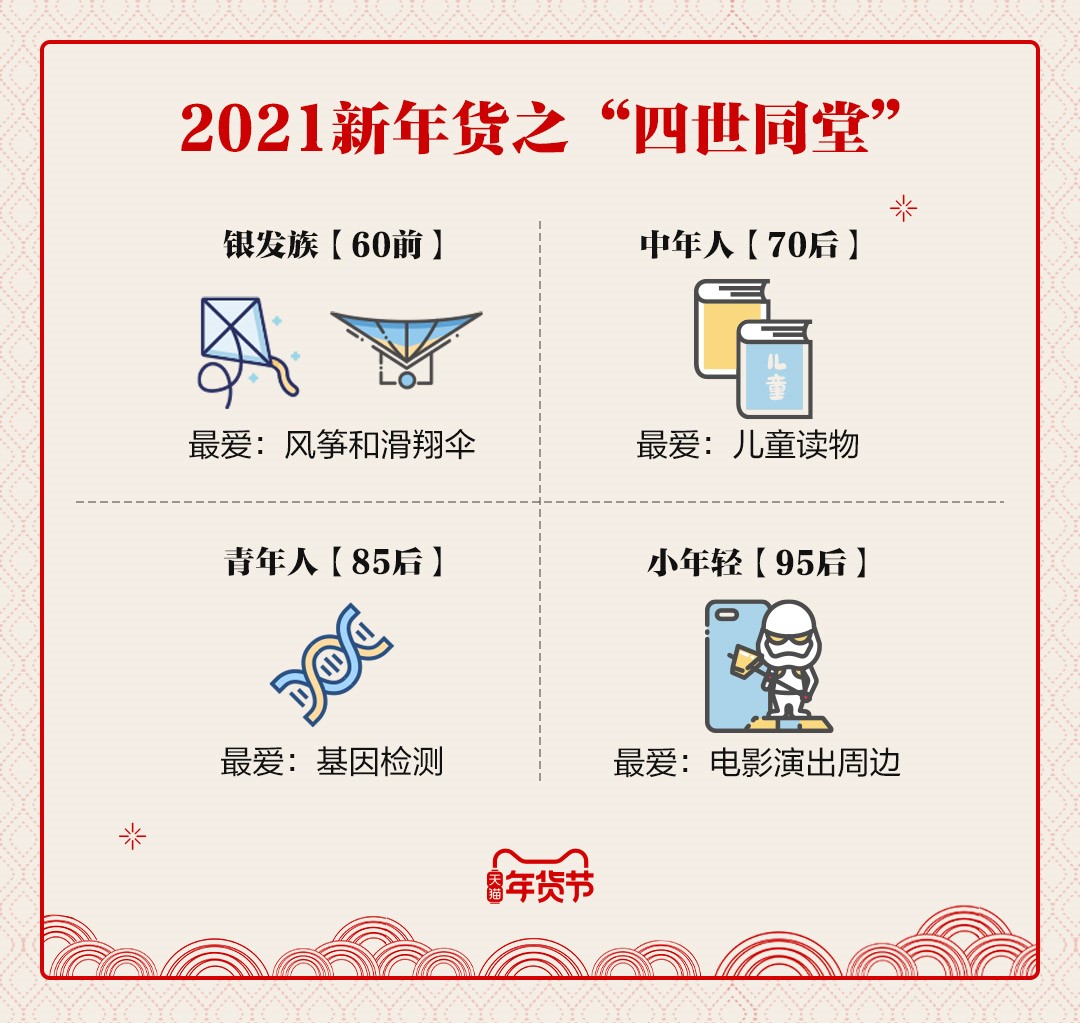 爱上新年货的,不只是90后,还有60后。在银发族的购物车里,有收音头、运动护具,还有风筝和滑翔伞。80后一边陪给孩子囤网课、一边参加在线教育和培训充电,95后年轻人不仅喜爱电影演出周边,也爱收纳整理。