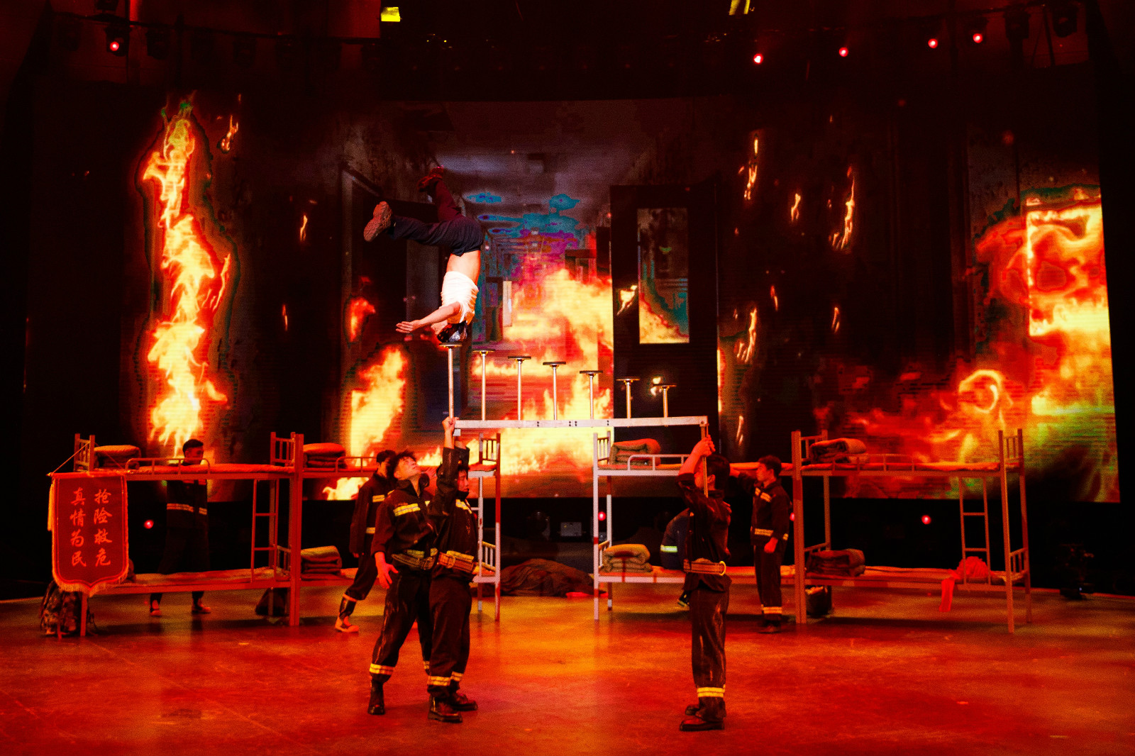 本周,由五位硬汉组成的功夫小子将带来《逆行者》,致敬保家卫国的消防战士。为了更深入地了解角色,他们还特意前往消防队“取经”,亲身体验消防兵的训练日常。舞台上,功夫小子不仅再次展现了不可思议的头顶实力,以头部为支点节节攀登六阶架子,他们贴合消防兵角色的火场情境表演,更是让观众热血沸腾。