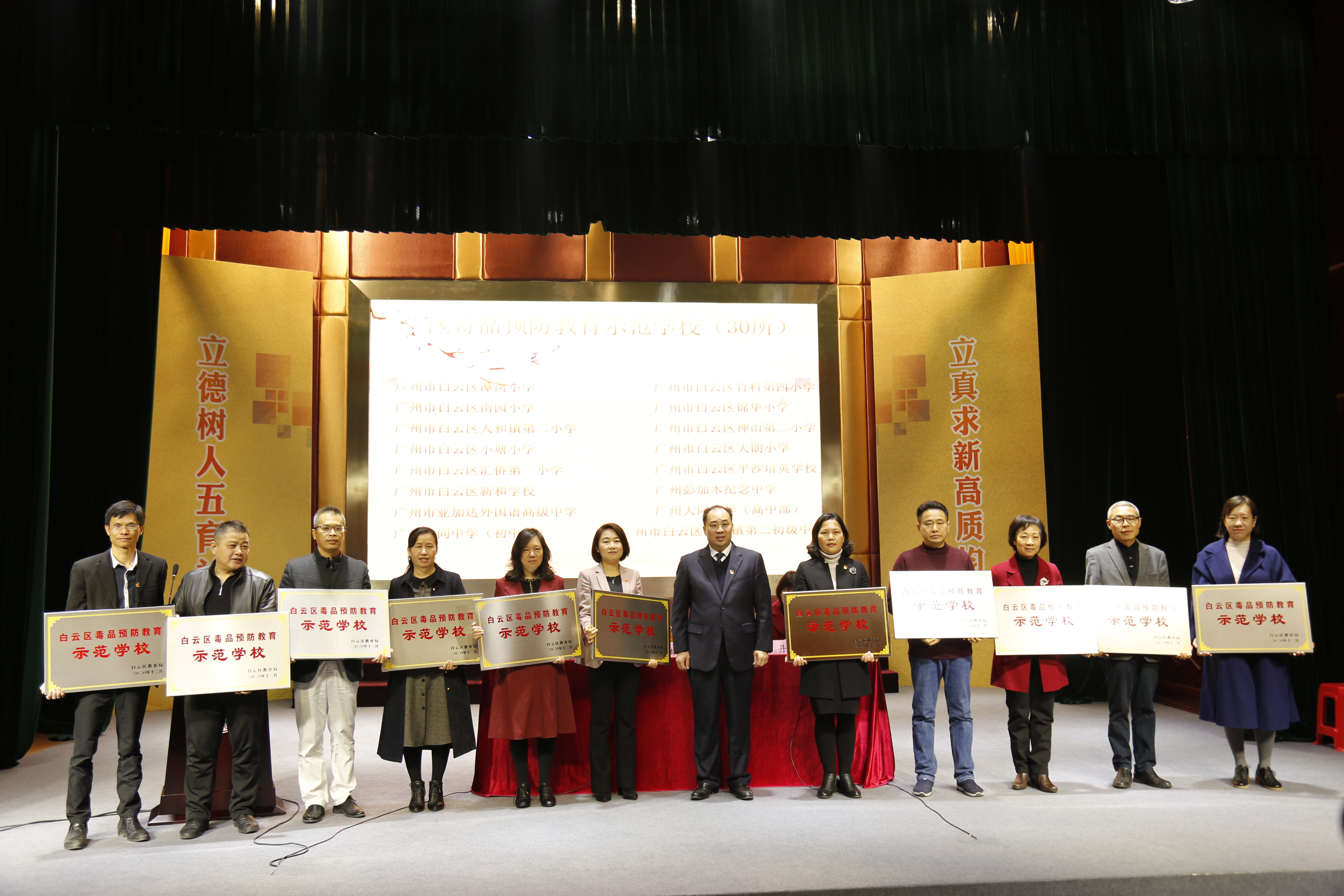 会上,白云区教育局副局长曾丹宣读了德育三年行动先进单位和个人的表彰决定,白云区教育局党组书记、局长杨雄忠为德育品牌学校、心理健康教育示范学校、家庭教育示范学校、书香校园示范学校、毒品预防教育示范学校颁发了牌匾。