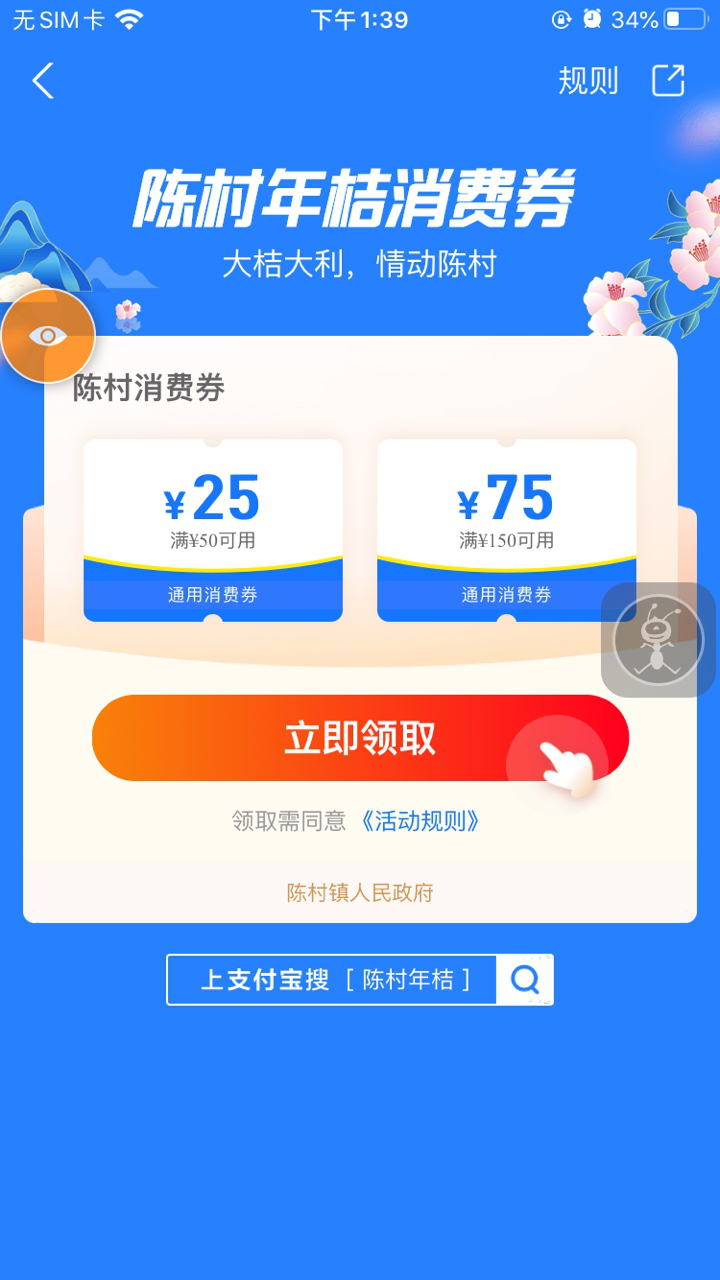 今年的陈村年桔依旧高产,但由于受到疫情影响,传统花市取消、国外订单“腰斩”等等突发情况使得年桔销路受阻。为了进一步促进年桔的销路,陈村镇在支付宝平台向广大消费者发放年桔消费券。2021年1月23日到2021年1月25日期间,每天上午10点发放10000个消费券包,共发放30000个。其中,每个消费券包中都含有两张满减消费券,1张满50元减25元,1张满150元减75元。此次发消费券总额达到了300万。记者今日上午10时准时打开支付宝,发现今日发放的年桔消费券已经被抢完。1月24日、1月25日还有两次机会,街坊们调好闹钟啦!