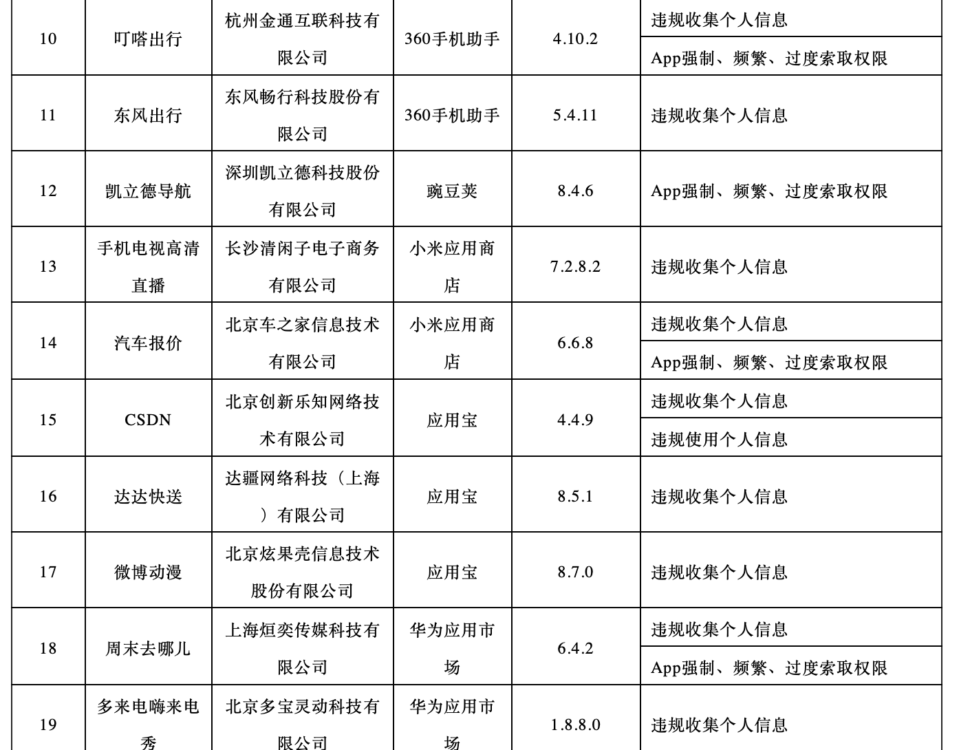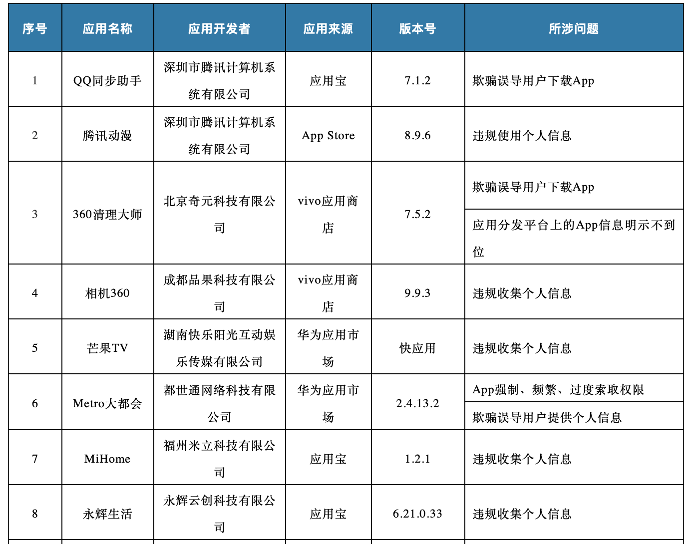 值得留意是,此次通报的多款APP,不乏用户熟悉的应用程序,例如360清理大师、芒果TV、叮嗒出行、艺龙酒店、114票务网、人人车二手车、WiFi钥匙、无忧行等,主要问题涉及违规收集个人信息、欺骗误导用户下载APP、APP强制、频繁、过度索取权限、强制用户使用定向推送功能等。