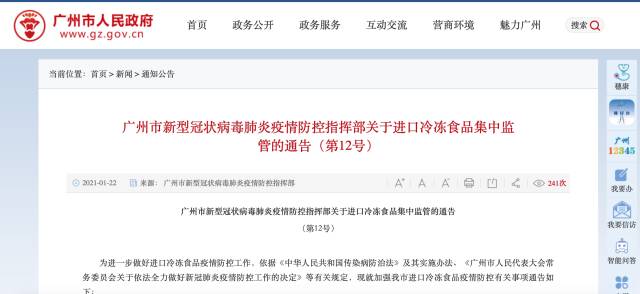 1月22日,广州市新型冠状病毒肺炎疫情防控指挥部发布《广州市新型冠状病毒肺炎疫情防控指挥部关于进口冷冻食品集中监管的通告(第12号)》。