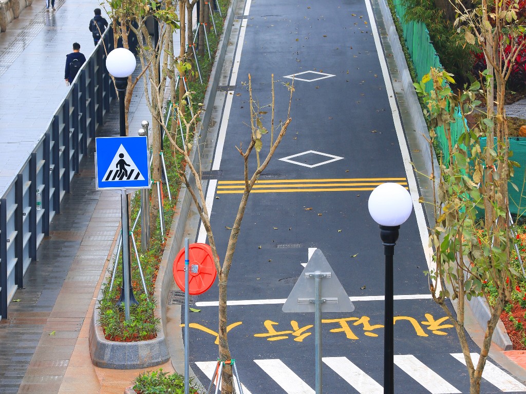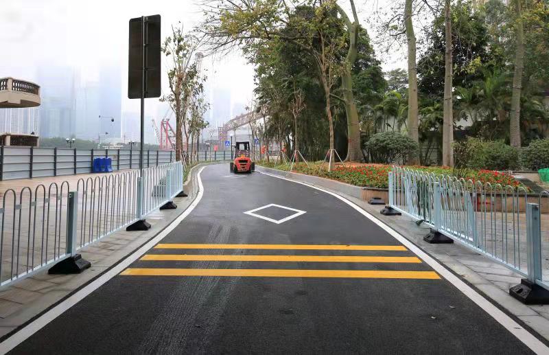 记者在现场看到,新修建的通道东边起点在广州国际媒体港西北面,紧接已经投入使用多年的滨江东路延长线路面,道路右侧竖着“滨江东路”的指示牌。道路沿着珠江岸线铺设,北侧是绿化和江边人行道。向西一路直通广州大桥桥面下,与滨江东路相连通。