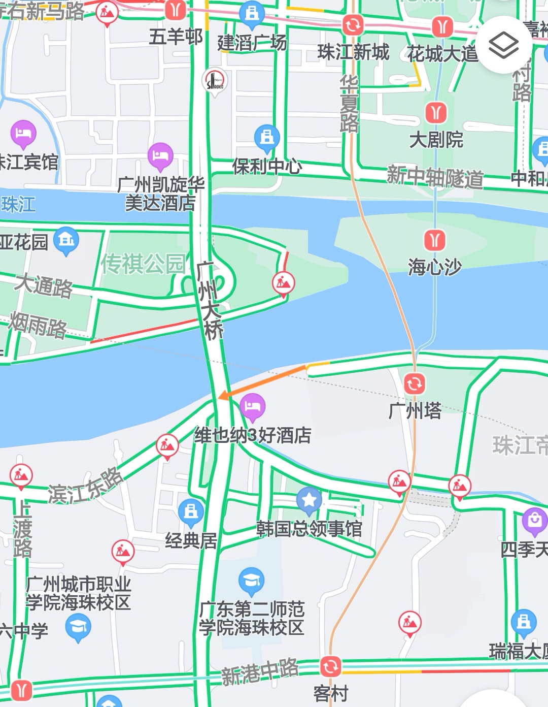 多年来,从广州塔和广州国际媒体港到滨江东路要绕行艺苑路、艺洲路,路程约为1.6公里,至少要经过6个红绿灯路口。由于艺洲路一带在进行地铁施工,日常高峰期道路较为拥堵。遇上节假日,广州塔周边人流量大,道路拥堵十分严重,碰上重大节日,甚至要一小时从能从广州塔到滨江东。滨江东路延长线(媒体港—广州大桥段)东往西方向投入使用后,路程缩短为400米,将大大缓解车辆通行压力。