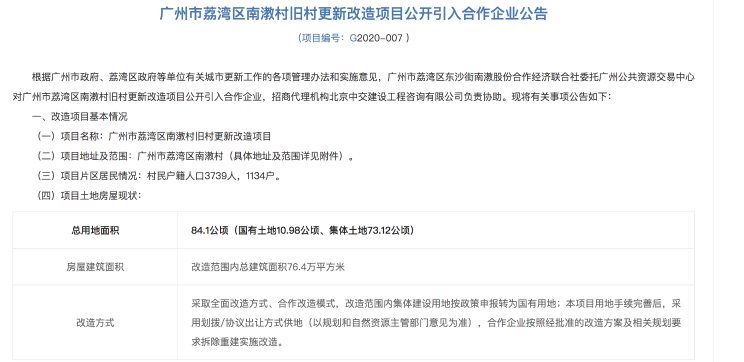 据悉,荔湾南漖村改造在2018年底就完成了改造意愿的表决工作,改造意愿表决同意率高达99.73 %,其中8个社100%同意改造,2个社同意率超过98%。2019年1月,南漖联社股东代表大会召开,表决同意了南漖旧村改造选择引入合作意向企业;2019年8月,南漖联社与中核工建设集团有限公司正式签订《荔湾区南漖村旧村改造项目合作意向协议》;2020年11月6日,南漖旧村更新改造项目基础数据调查成果公布, 2020年11月26日,南漖村正式登陆公共资源交易中心进行公开招商。