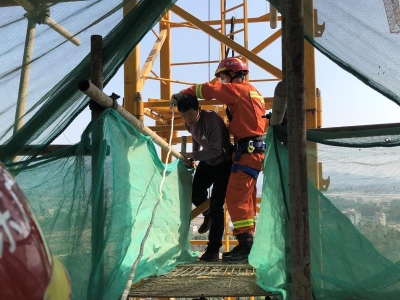 【工人被困70米塔吊,惠州消防高空救援】昨日12时25分,惠州市惠城区水口街道办事处某建筑工地塔吊上有人员被困,情况十分危急,急需救援。接警后,东平消防救援站立即出动1辆抢险救援消防车、6名指战员赶赴现场实施救援。详情》》
