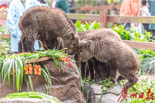 金毛羚牛是我国的一级保护动物,与大熊猫、金丝猴、朱鹮齐名的秦岭四大国宝动物。广州日报全媒体记者今日看到,金牛羚牛幼崽目前在长隆野生动物世界动物幼儿园生活着,健康状况良好。去年年底至今,共有13头金毛羚牛幼崽出生,出生时通体呈灰棕色,该颜色是与羚牛栖息地环境相适应的,是物种进化选择的结果。现在它们体重平均在8.6公斤以上,头上虽还没有长出成年羚牛标志性的“牛角”,但“铜铃”般的大眼睛和时刻竖起的小耳朵,颈及颌下垂顺着“短胡须”非常讨喜。