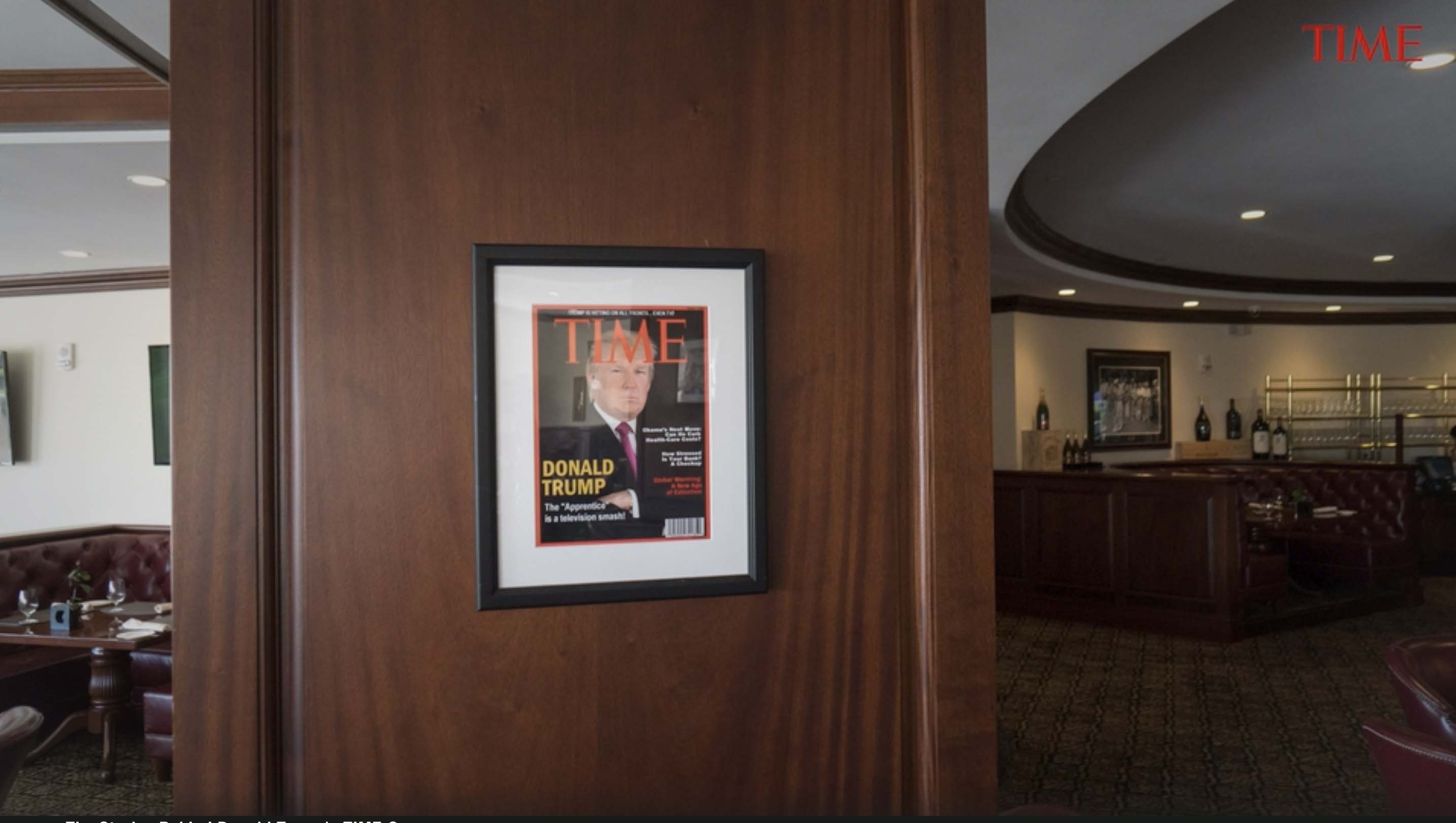 特朗普的会所中挂着的假《时代》封面。后来,《时代》周刊要求特朗普团队将其取下。图片来源:time.com