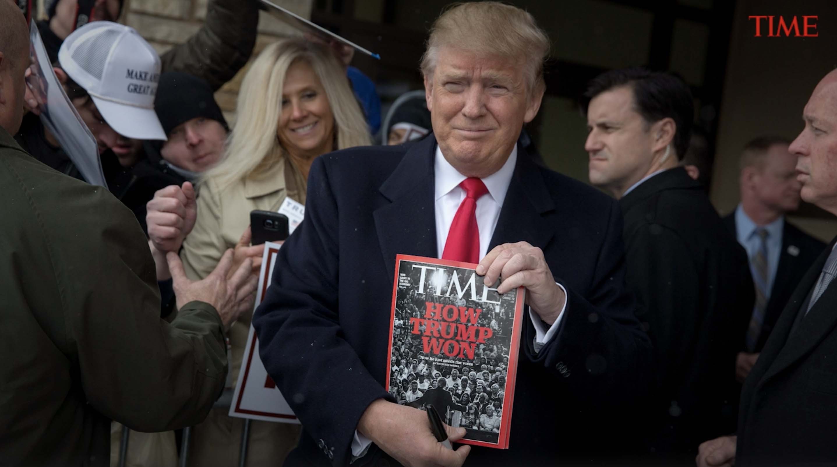 特朗普对《时代》周刊封面一直有种“执念”。在成为总统之前,他就在集会、社交媒体上为成为《时代》周刊“年度人物”积极造势,他的几家俱乐部中甚至挂着后期合成的假”封面“。2016年大选期间,他还带着一期报道他如何赢得选民的《时代》周刊出现在采访、集会等公共场合,向观众和媒体展示。