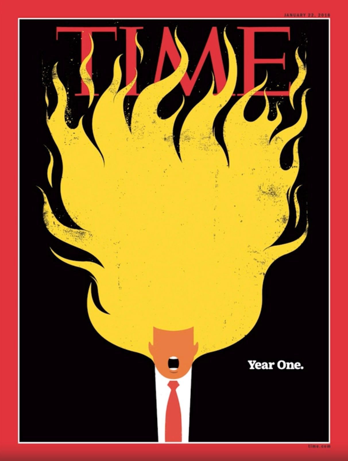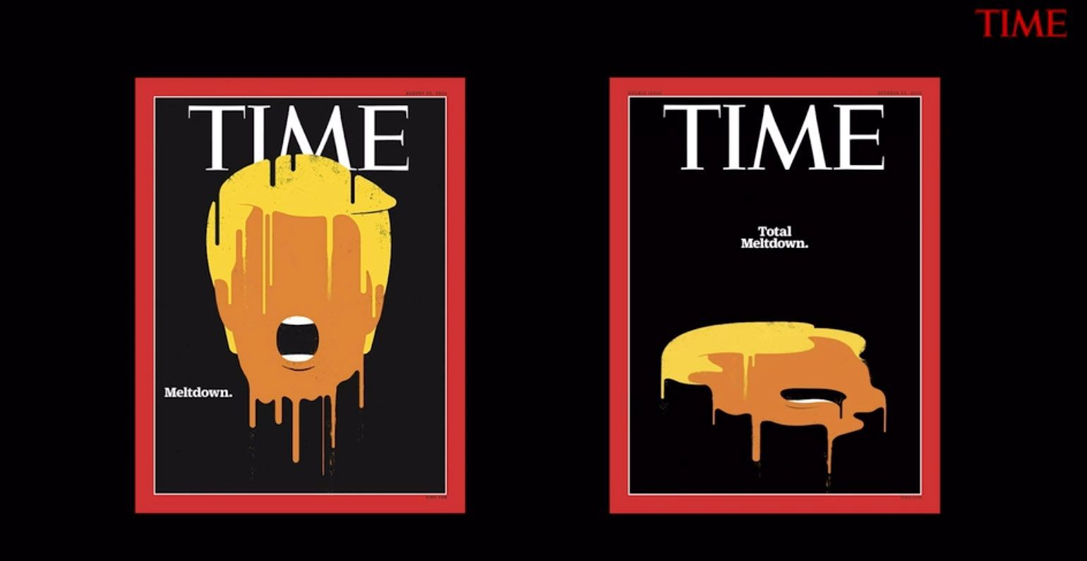 2016年美国大选期间,《时代》周刊有7期封面使用了特朗普的形象。当年共和党全国大会后,特朗普支持率暴跌,此时出版的一期名为“崩盘”(Meltdown)的封面很快吸引了大量关注。视觉艺术家埃德尔·罗德里格斯(Edel Rodriguez)用两个大面积色块就抓住了特朗普的形象特征,画面中的色块正在融化、流淌,象征着特朗普形象的崩溃。
