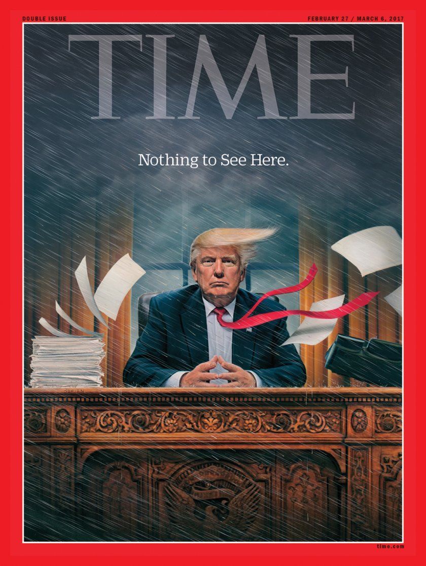 2017年2月27日的《时代》封面就是一副插画,标题为《这里没什么可看的》(Nothing to See Here),来自与《时代》合作30多年的艺术家蒂姆·奥布莱恩(Tim O’Brien),他的风格更加写实。画面中上演着狂风暴雨,而特朗普却一脸平静地坐在桌前,反映了当时刚上任的特朗普所面对的混乱境况。在讲述这期封面的背后故事时,奥布莱恩说:“创作这个封面就像想象一部电影,我在脑海中已经看到了画面:纷飞的雨丝、风将纸张从桌上掀起、雨滴落在桌子上溅起的水花。当《时代》周刊创意总监派恩在邮件中问我,是否可以画一幅风暴中的特朗普,我立马就看到了这个画面。”