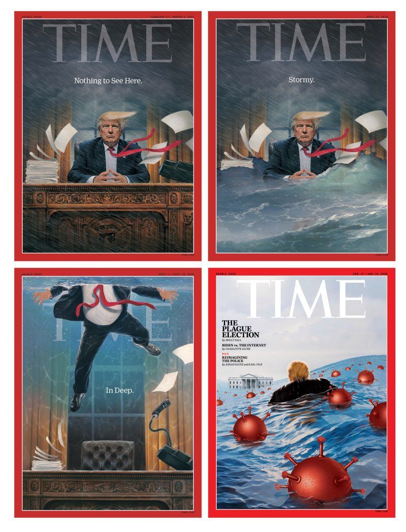 同一系列的4个封面对比:《这里没什么可看的》(Nothing to See Here)、风雨如磐(Stormy)、深陷(In Deep)、《瘟疫大选》(Plague Election)。图片来源:time.com