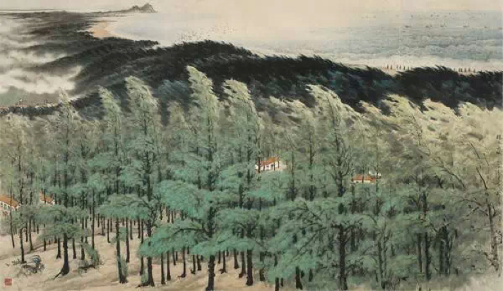 关山月国画《绿色长城》是山水画创新的代表作品,不仅表现的内容新,而且笔墨更新,在20世纪70年代初颇具影响。