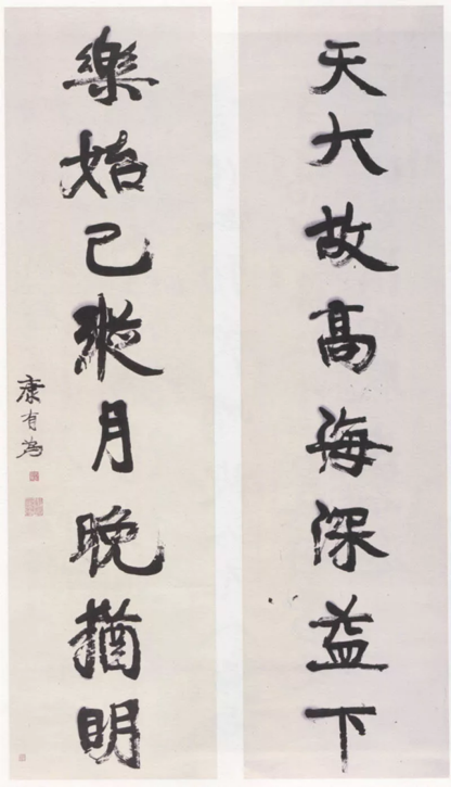 康有为书法的一个显著特征就是“化方为圆”,他在博览群碑并钻研北魏摩崖石刻《石门铭》后,笔法追求气势,不拘小节,体势洞达,宽博舒展,然而却是用圆笔较多,这是他对魏碑方笔的一种改革。