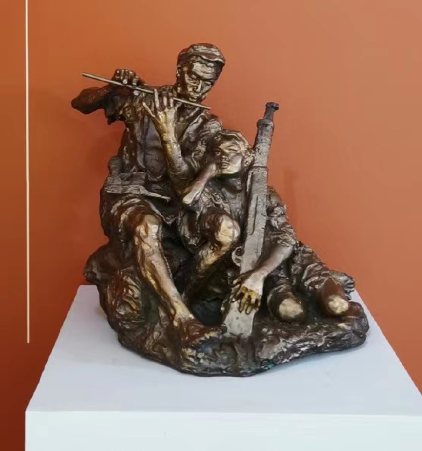 这个老战士就是《艰苦岁月》雕塑的中那个吹笛子的老人。作品成功地通过老战士吹笛、小战士偎依身旁倾听的造型,体现出战争年代的革命乐观主义精神和向往革命胜利的信念。