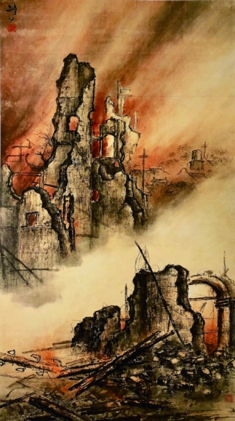 国画《东战场的烈焰》描绘了1932年“一·二八”事变中被日军炸毁的上海闸北东方图书馆之景,现收藏于广州艺术博物院。