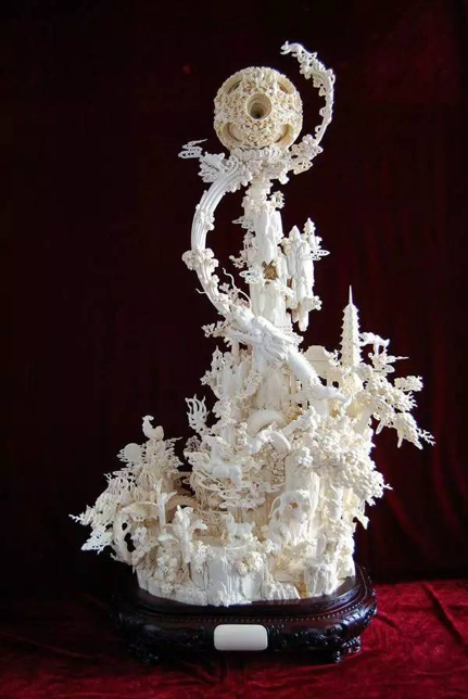 牙雕《盛世乾坤》是中国工艺美术大师、首批国家非物质文化遗产“象牙雕刻”的代表性传承人李定宁耗30余年创作而成的珍藏杰作,作品中直径17厘米57层的象牙球,为目前世界上层数最多、直径最大的象牙球。