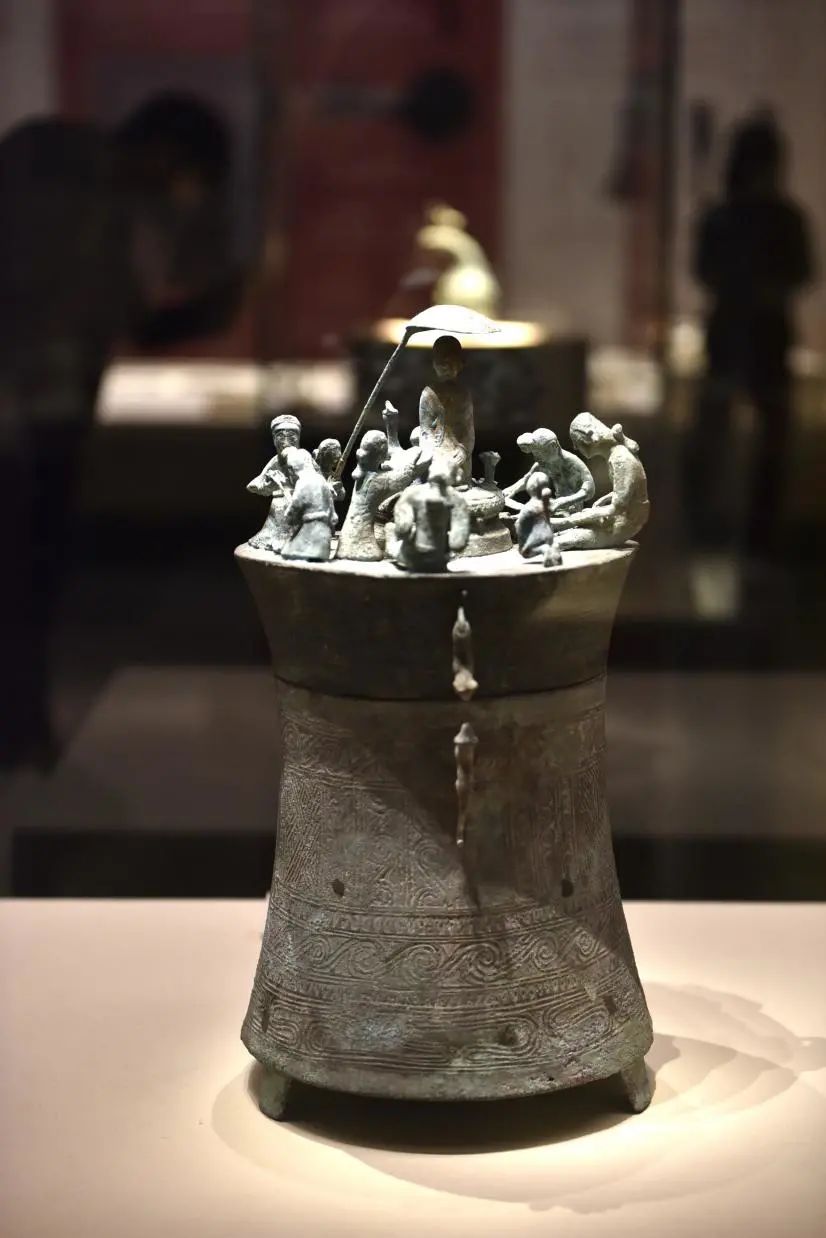 贮贝器多用于贮放贝币,其器盖上雕铸了千姿百态的人物、动物或大型场景,主题涵盖祭祀、纺织、狩猎、掳掠、赶集、舞蹈等。图为纺织场面贮贝器。