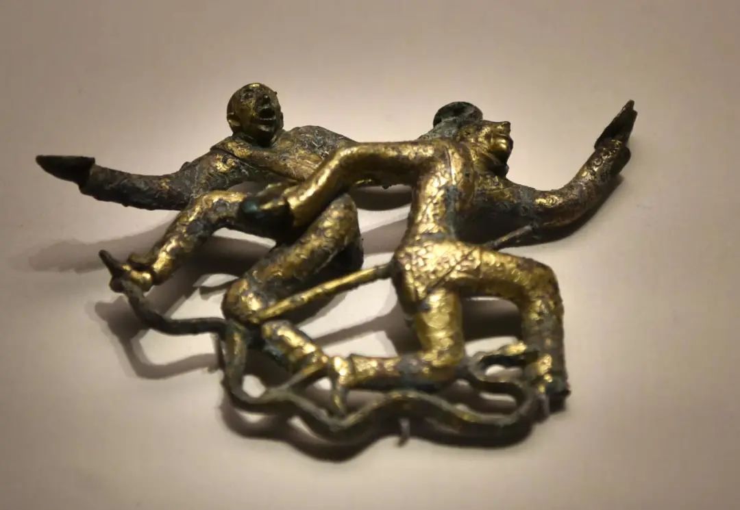扣饰是滇人装饰于腰间的饰品,背面有一横制的矩形扣,便于穿系或悬挂,以动物纹为装饰的扣饰多以掳掠、剽牛、乐舞、狩猎、动物搏斗为主题。图为二人盘舞鎏金青铜扣饰。