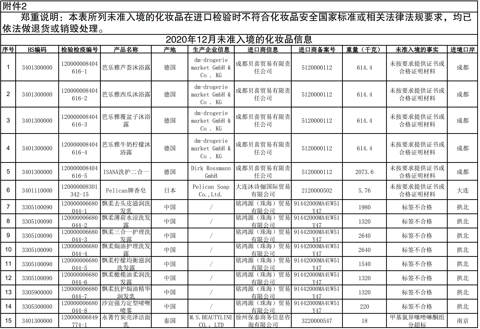 日前,中华人民共和国海关总署公布了2020年12月全国海关在口岸监管环节检出安全卫生项目不合格并未准入境食品化妆品信息,其中不合格化妆品共15批,知名品牌飘柔、沙宣等均“上榜”。