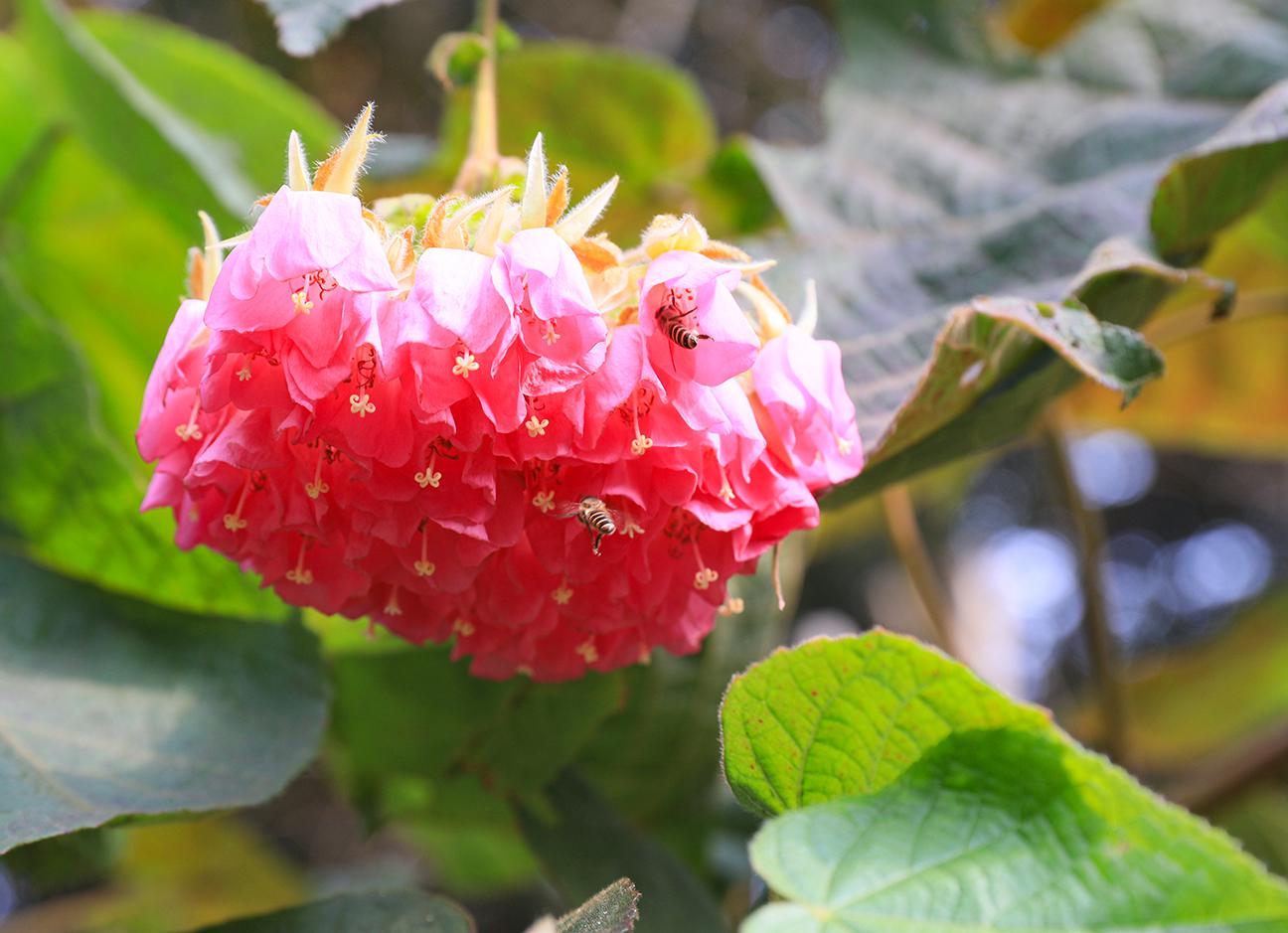据介绍,非洲芙蓉是梧桐科非洲芙蓉属,热带或亚热带常绿灌木。别称有吊芙蓉、粉红球、百铃花和热带绣球花等。非洲芙蓉树冠圆形,枝繁叶茂,花从叶腋间伸出,伞形花序,悬垂花球,花色粉红,一朵五瓣,冬季吐艳,是理想的蜜源植物。